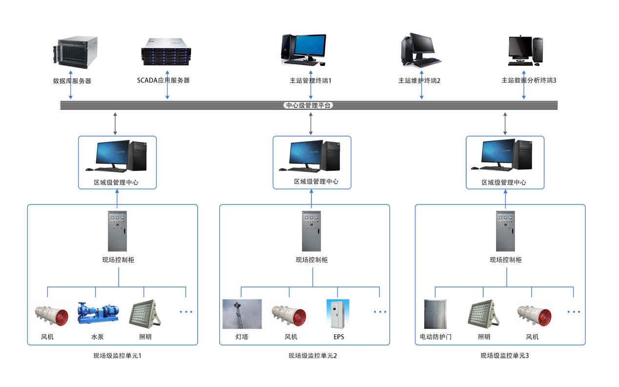 公共防災(zāi)救援設(shè)備監(jiān)控系統(tǒng)采用多層分級(jí)結(jié)構(gòu),自上而下劃分為中心級(jí)管理平臺(tái)、區(qū)域級(jí)管理中心和現(xiàn)場級(jí)監(jiān)控單元。其中現(xiàn)場級(jí)監(jiān)控單元包括水泵,風(fēng)機(jī),照明,電動(dòng)防護(hù)門,燈塔,EPS等現(xiàn)場設(shè)備以及負(fù)責(zé)現(xiàn)場設(shè)備監(jiān)控的現(xiàn)場控制柜。
